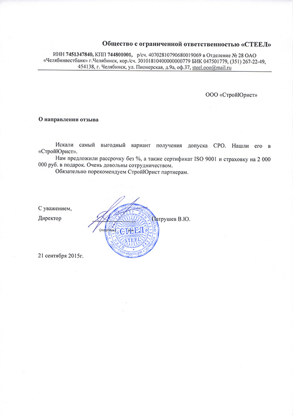 Отзывы клиентов "СтройЮрист" по вступлению в СРО в Гатчине